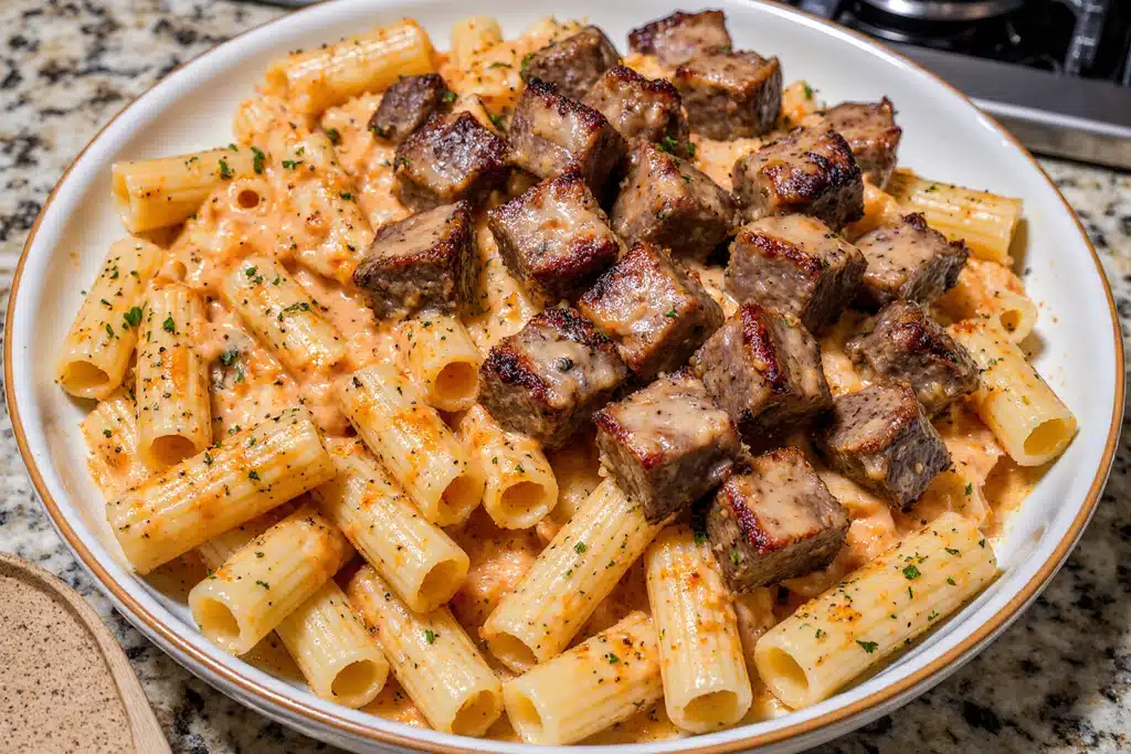 Rigatoni is the ideal pasta here—its wide tubes and ridges trap the sauce inside and out, ensuring every forkful is packed with flavor. When combined with the savory steak, it creates a balanced, luxurious texture that’s impossible to resist.