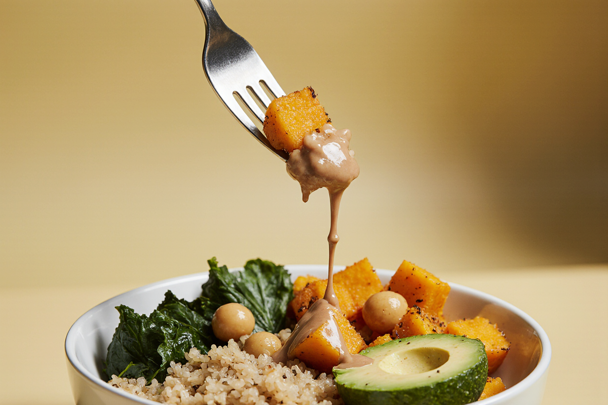 - Balance textures: soft grains, crisp toppings, creamy dressing.