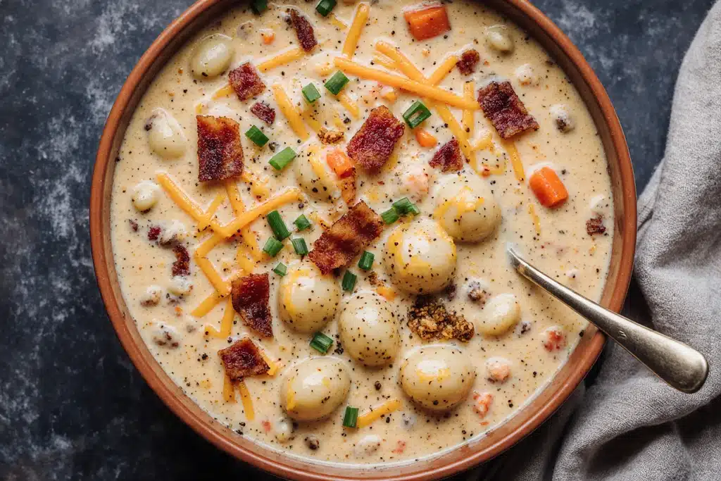 We present Bacon Cheddar Gnocchi Soup, a rich, creamy, and deeply comforting soup that combines pillowy gnocchi, crispy bacon, tender vegetables, and melted cheddar cheese in a velvety broth. This soup is one of those recipes that instantly becomes a family favorite thanks to its bold flavor, satisfying texture, and straightforward preparation.