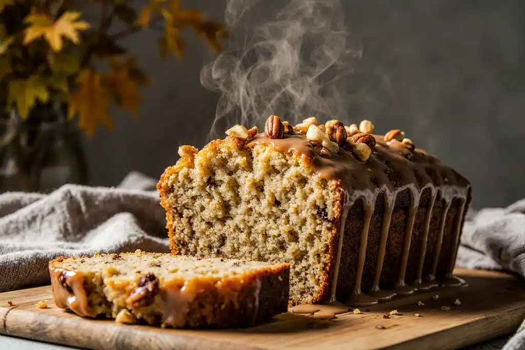 6. Cool and glaze: Cool in pan 15 minutes, then transfer to wire rack. Warm maple syrup for glaze, whisk in powdered sugar until smooth. Drizzle over cooled bread. Slice and serve.