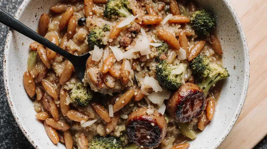Quick, flavorful, and easy one-pan meal combining savory chicken sausage, tender broccoli, and creamy orzo pasta, finished with melty Parmesan cheese.