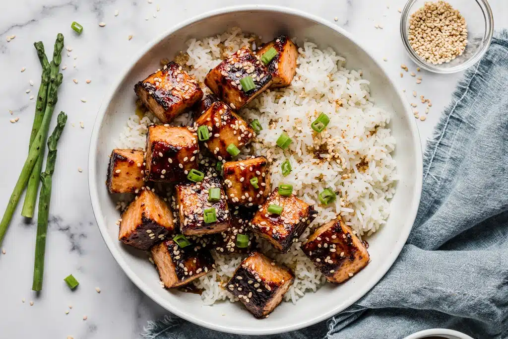 These salmon bites feature a crunchy exterior from seasoning and searing, coated in a sticky honey garlic glaze that rivals takeout. High-protein and omega-3 rich, they suit keto diets with low-carb swaps. Competitors lack full method comparisons and skin removal guides, making this comprehensive version superior.