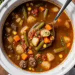 Crockpot Vegetable Beef Soup is a hearty, nutritious soup made with tender beef, potatoes, corn, green beans, and a variety of vegetables simmered in a savory broth. Perfect for slow cooking and meal prep.