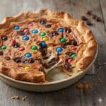 M&M Chocolate Chip Pie delivers a giant, gooey cookie loaded with chocolate chips and colorful M&Ms in one easy pie pan. This shareable dessert serves 8-10 with just 10 minutes prep and a 25-minute bake, perfect for birthdays, parties, or weeknight treats.