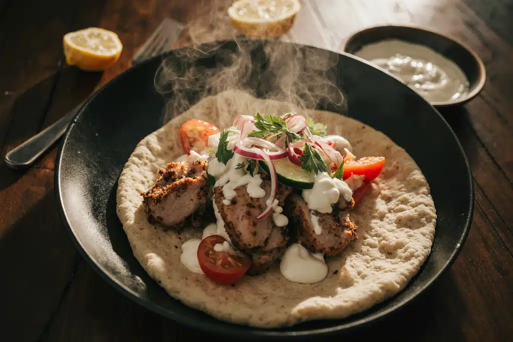 - Pita wraps: Warm whole wheat or gluten-free pita. Layer chicken, sauce, diced tomatoes, sliced red onion, shredded lettuce, and pickles.