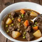 Tender Slow Cooker Beef Stew with fall-apart chuck roast, hearty Yukon gold potatoes, carrots, and peas in a rich savory broth. This easy crockpot recipe features pro techniques like searing beef for deep flavor and a butter swirl for silky finish. Perfect comfort food for chilly evenings!