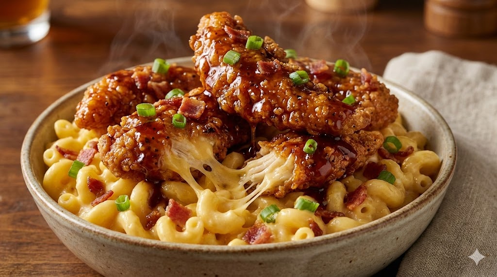 Crispy on the outside, juicy inside chicken meets the creamiest mac and cheese you’ve ever made, all tied together with a glossy honey pepper glaze that’s addictive.